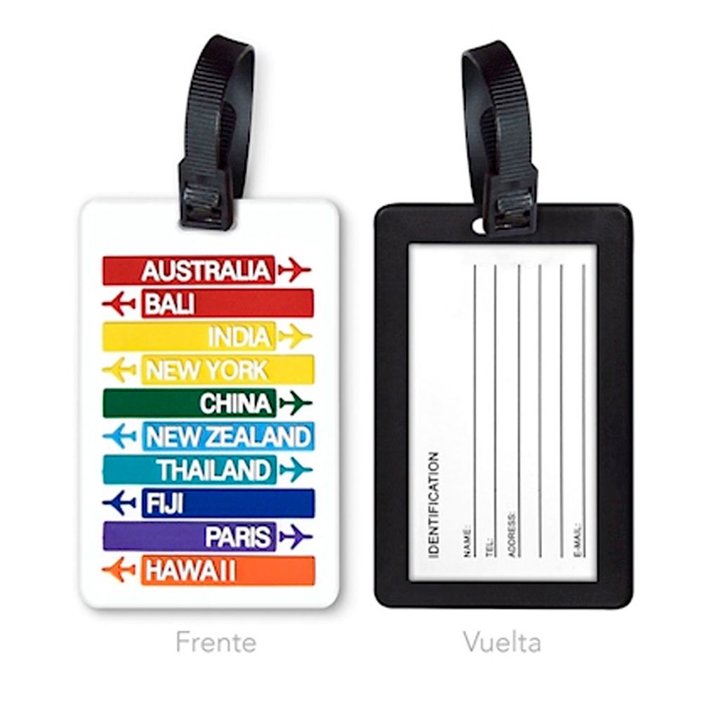 Tag de Maleta microinyectado, en plastisol, inyeccion en 3 colores mas base un lado y retira en serigrafia, medidas 9cm largo x 5.5 cm ancho, correa negra de plastico y serigrafia.