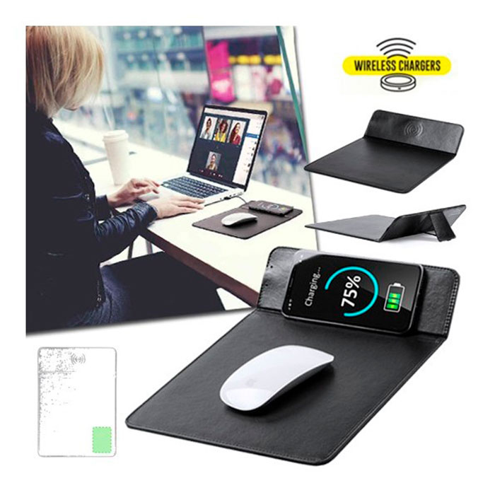 Alfombrilla de polipiel con cargador inalámbrico integrado y capacidad de carga de 1.000 mA -cable micro USB incluido- Con base antideslizante y soporte para móvil integrado. Compatible con dispositivos equipados con tecnología de carga inalámbrica y presentada en atractiva caja de diseño. Inalámbrico 5W. Antideslizante