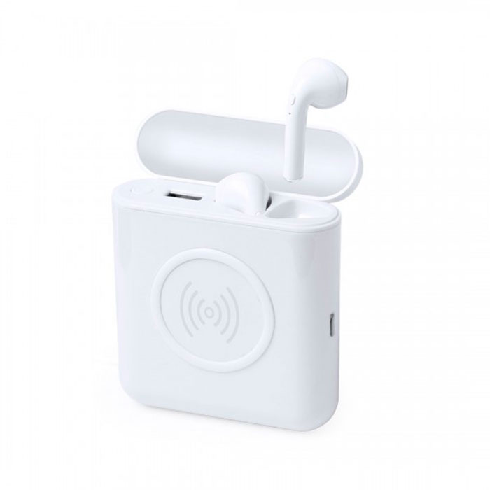 Set de auriculares intraurales con batería auxiliar externa y carga inalámbrica. Auriculares Bluetooth® 4.2 en elegante color blanco, con controles integrados y función manos libres. Base de carga a juego, con batería auxiliar externa de carga inalámbrica o por cable de 5.200 mAh de capacidad y conexión de entrada Tipo C. Recargables mediante puerto USB -cable incluido- y base con tapa de bisagra. Presentados en atractiva caja de diseño. Las capacidades mostradas en todas nuestras baterías auxiliares externas son reales, incorporando todas ellas baterías de grado A y no recicladas, con una vida útil de al menos 500 ciclos de carga y según normativa CE. Además, están fabricadas conforme a los estándares RoHS y en cumplimiento con los siguientes requisitos de seguridad: Sistema de protección contra sobrecarga del power bank. Sistema de protección contra descarga completa que proporciona una mayor durabilidad del power bank. Sistema de bloqueo para evitar cortocircuitos. Sistema Inalámbrico 5W. 5200 mAh. Salida USB. Entrada Tipo C. Conexión Bluetooth. Batería 35 mAh
