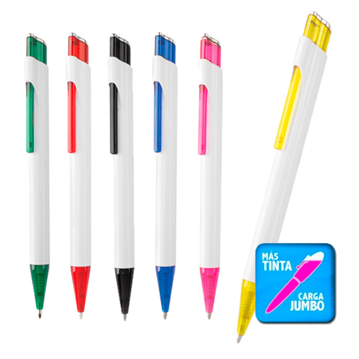 Bolígrafo de mecanismo pulsador de atrevido diseño bicolor con accesorios en vivos colores translúcidos y cuerpo de suave acabado en color blanco. Con clip a juego y tinta azul. Carga Jumbo