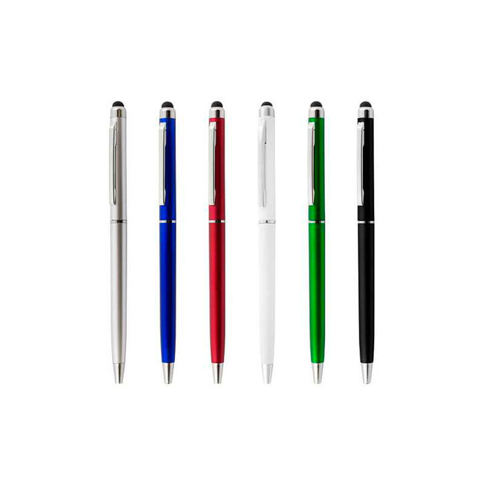 Bolígrafo de mecanismo giratorio con cuerpo en aluminio de suave acabado metalizado en vivos colores. Accesorios en color plateado y touch.