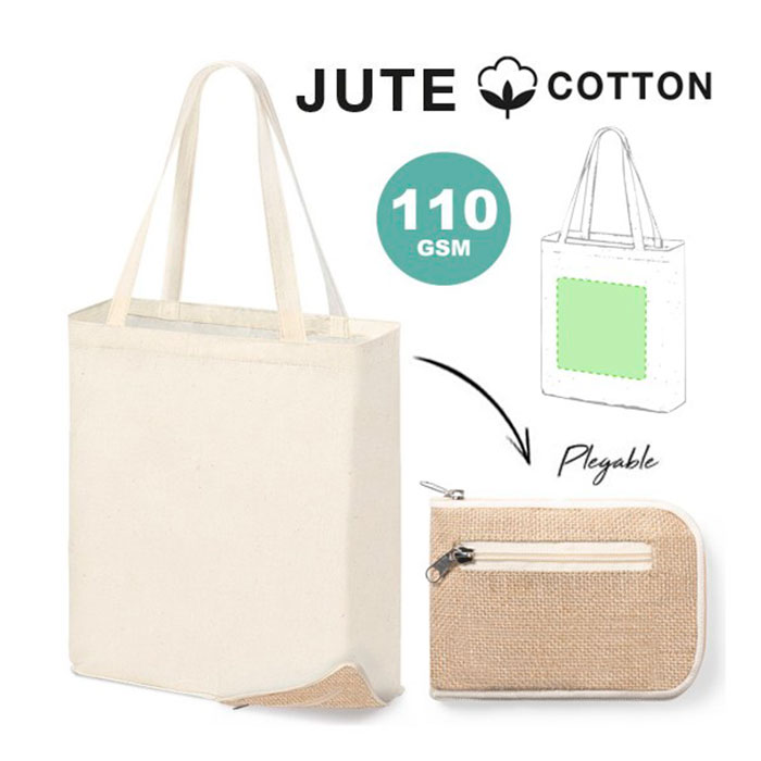 Bolsa plegable de línea nature en combinación de materiales 100% algodón de 110 g/m2 y base en yute, con bolsillo. Asas de 57 cm con refuerzo, de acabado cosido y resistencia hasta 8 kg de peso. Plegado de pequeño tamaño mediante cremallera para un fácil transporte.