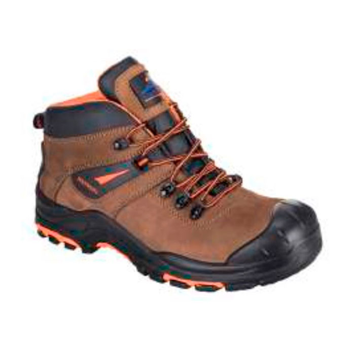 Liderando la evolución de las botas deportivas de seguridad ligeras. Piel flor de nobuk resistente al agua. Bota deportiva de seguridad S3 con cubierta anti-arañazos, puntera de fibra de vidrio, plantilla de composite anti-penetración y HRO 300°C.