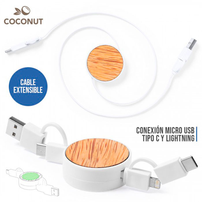 Cable extensible USB con función cargador y de transferencia de datos. De línea nature y fabricado en coco del que, tras el consumo de su fruto, se pueden obtener multitud de productos, contribuyendo a la sostenibilidad del planeta y fomentando el uso de materias primas naturales. Conexiones Tipo C (entrada y salida), y dual Micro USB/Lightning. Con zona lisa para marcaje y presentado en caja individual de diseño eco en cartón kraft. Apto para transferir datos. Cable Extensible. Conexión Micro USB, Tipo C y Lightning 9V DC 2.1A