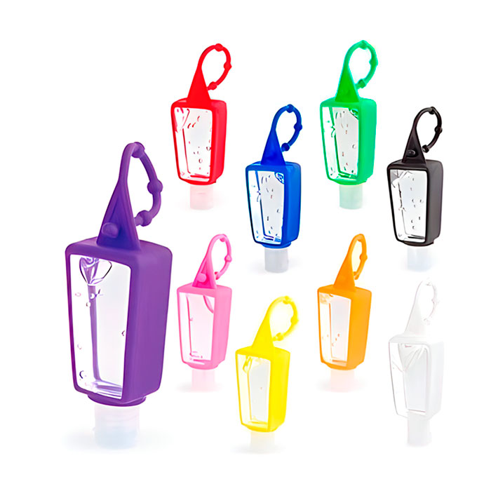 Botella para gel antiséptico, con sujetador de silicona de diferentes colores para llevarlo colgado. Capacidad: 30 ml.