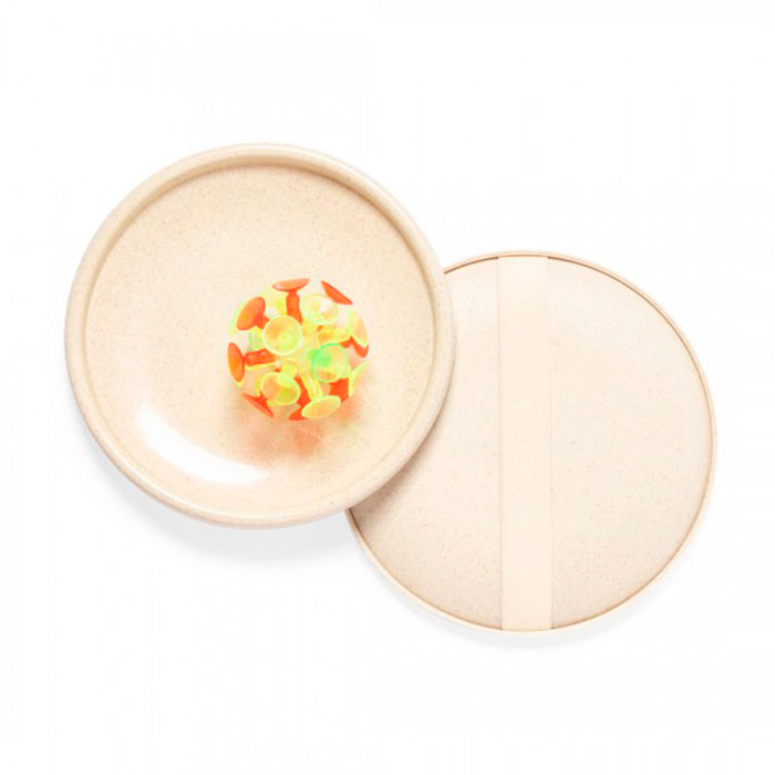Juego de pelota y palas de disco. Incluye pelota con ventosas y palas de disco lisas, fabricadas en resistente caña de trigo, con cinta elástica para las manos a juego. La caña de trigo fomenta la utilización de materias primas naturales, reduciendo así las emisiones contaminantes.