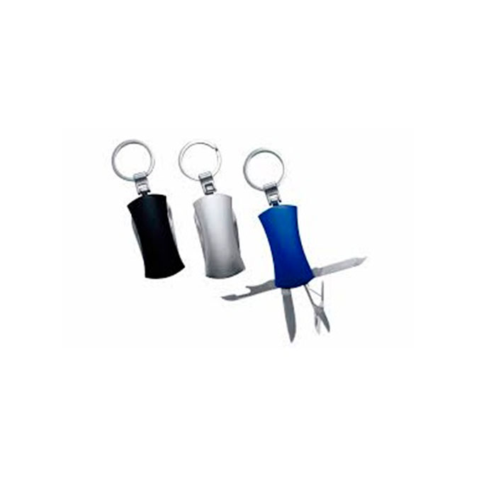 Llavero metalico 5 funciones: llavero, tijera, destapador, lija y cuchilla