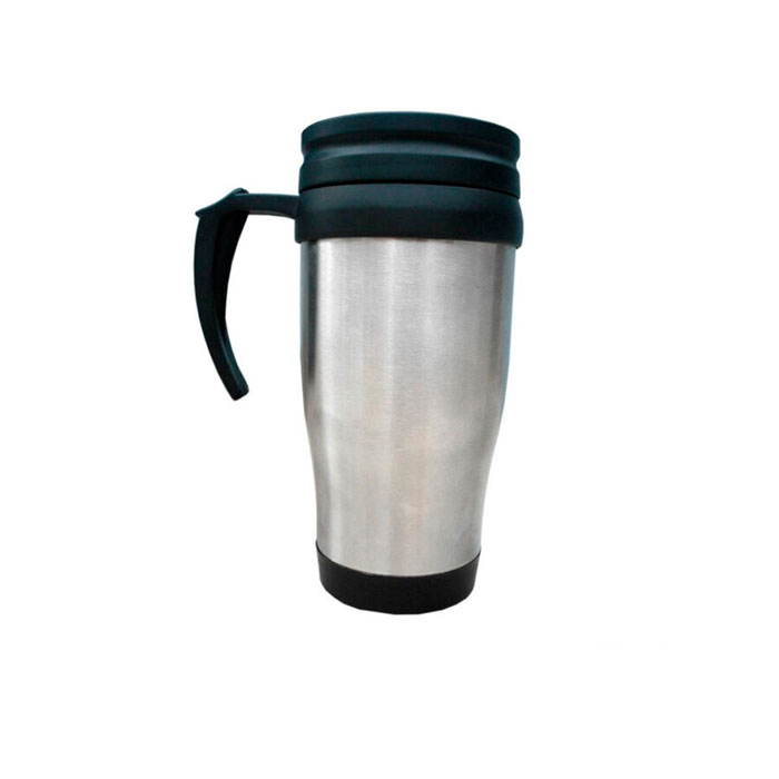 Mug, parte interior plástico en color negro, por fuera cuerpo de metal en color plateado, el borde del jarro, el mango (asa) y la base son de plástico color negro. Capacidad de 450ml.