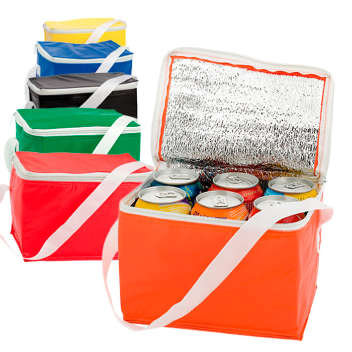 Nevera de 6 latas en resistente PVC de vivos colores. Interior isotermo en acabado de aluminio. Con cremallera y asa de transporte en color blanco a juego.