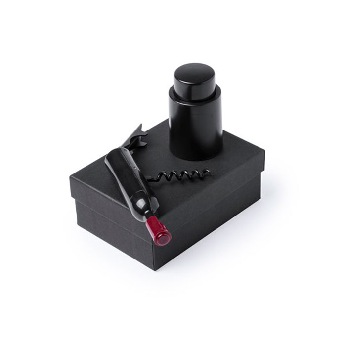 Original set de vinos con sacacorchos en forma de botella de vino y tapón con bomba de vacío. Presentado en estuche individual de cartón negro con interior en suave espuma troquelada. 2 Accesorios